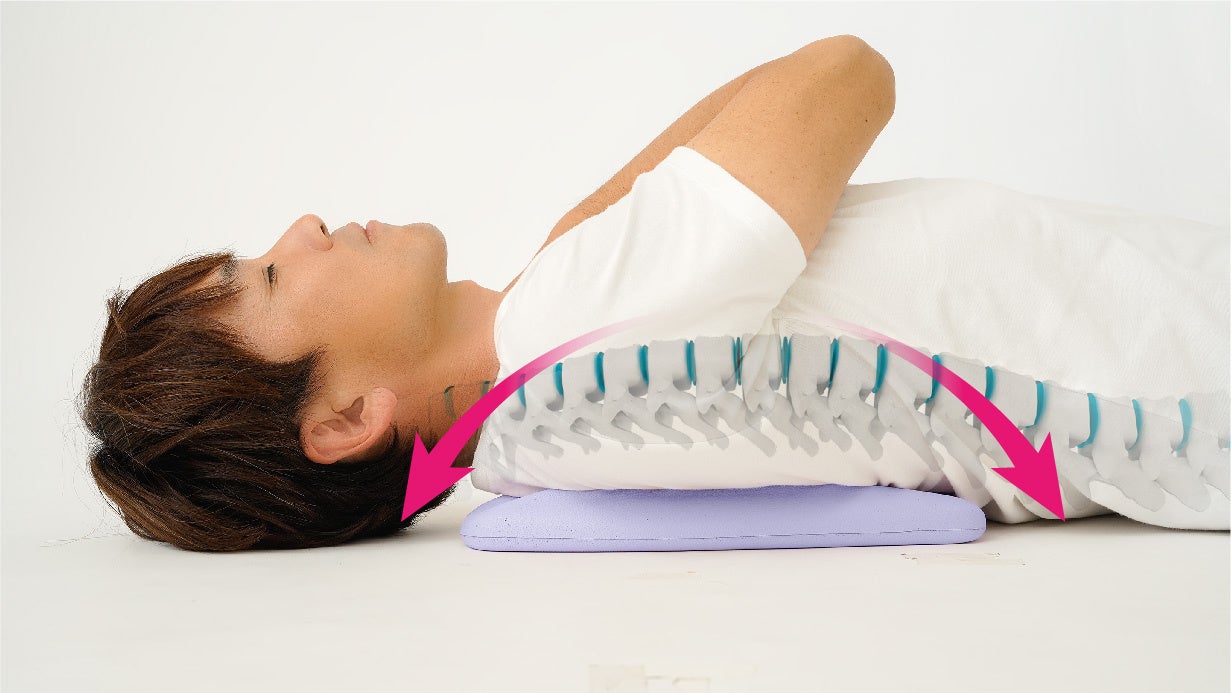 肩甲骨の部分が一番高くなるようにアーチ状に沿うことで、自然と背筋が押し上げられ、肩甲骨が引き寄せられるため、胸がグイっと開き、気持ちよく背筋を伸ばす構造になっています。