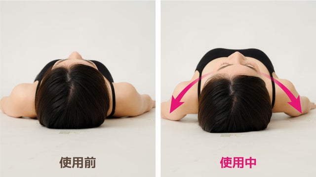 「Cellsh背筋ストレッチクッション」の上に寝転ぶと、肩甲骨をグイッと引き寄せて、背筋をぐい~んとのばす事ができます。