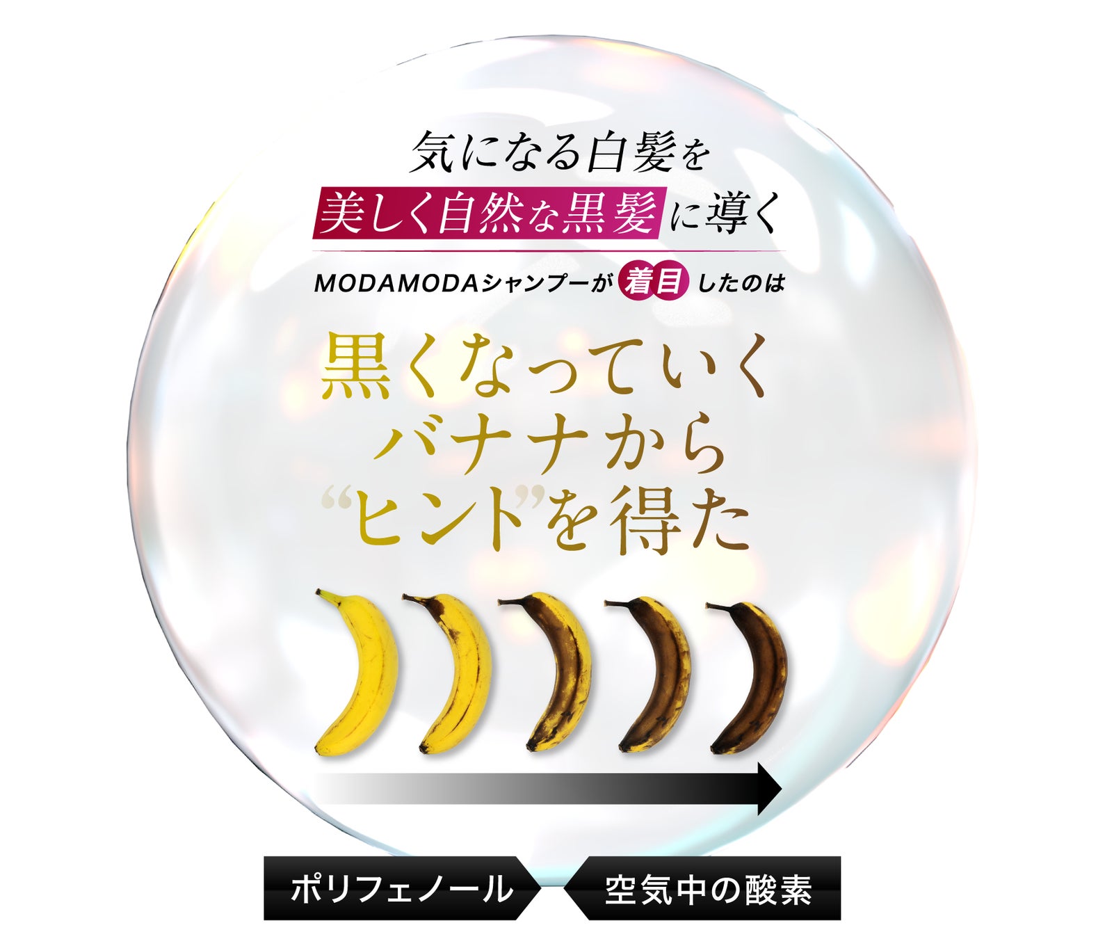 バナナやリンゴが空気中の酸素に反応して徐々に黒くなっていく原理からヒントを得て、褐色変化の仕組みから発見した成分を、より白髪染めシャンプーに適応させました。