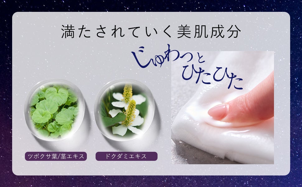 「ドクダミエキス」:日中のダメージを集中ケアして、キメを整えます。