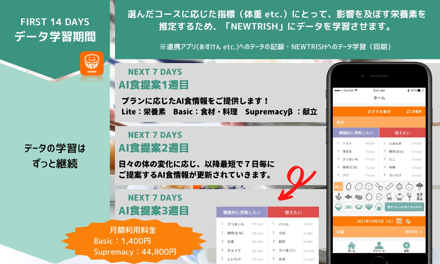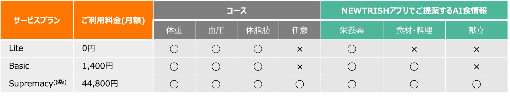 この度提供を開始した「NEWTRISH」のプランは、目標達成に必要な栄養素がわかる「Liteプラン(無料)」、必要な栄養素に加えて食材・料理名を知ることができる「Basicプラン(月額1,400円)」、目標達成のために栄養素量が最適化された献立が提案される「Supremacy(β版)プラン(月額44,800円)」の3つです。「Liteプラン」および「Basicプラン」は、体重、血圧、体脂肪の3つのコースの選択が可能であり、さらに、「Supremacy(β版)プラン」では3つのコースに加えて利用者が望む任意の目標を設定することが可能です。各プラン、開始から14日間をデータ学習期間とし、期間中に摂取した食事およびユーザーが選択した身体指標を記録します。(データの学習は14日間以降も継続)。その後、1週間に渡りプラン毎にAI食情報を提供します。AI食情報を提案する2週目以降からは、日々の体の変化に応じ、最短7日後に提案するAI食情報が更新されます。なお、全プラン、利用開始から2週間は無料でご利用可能です。