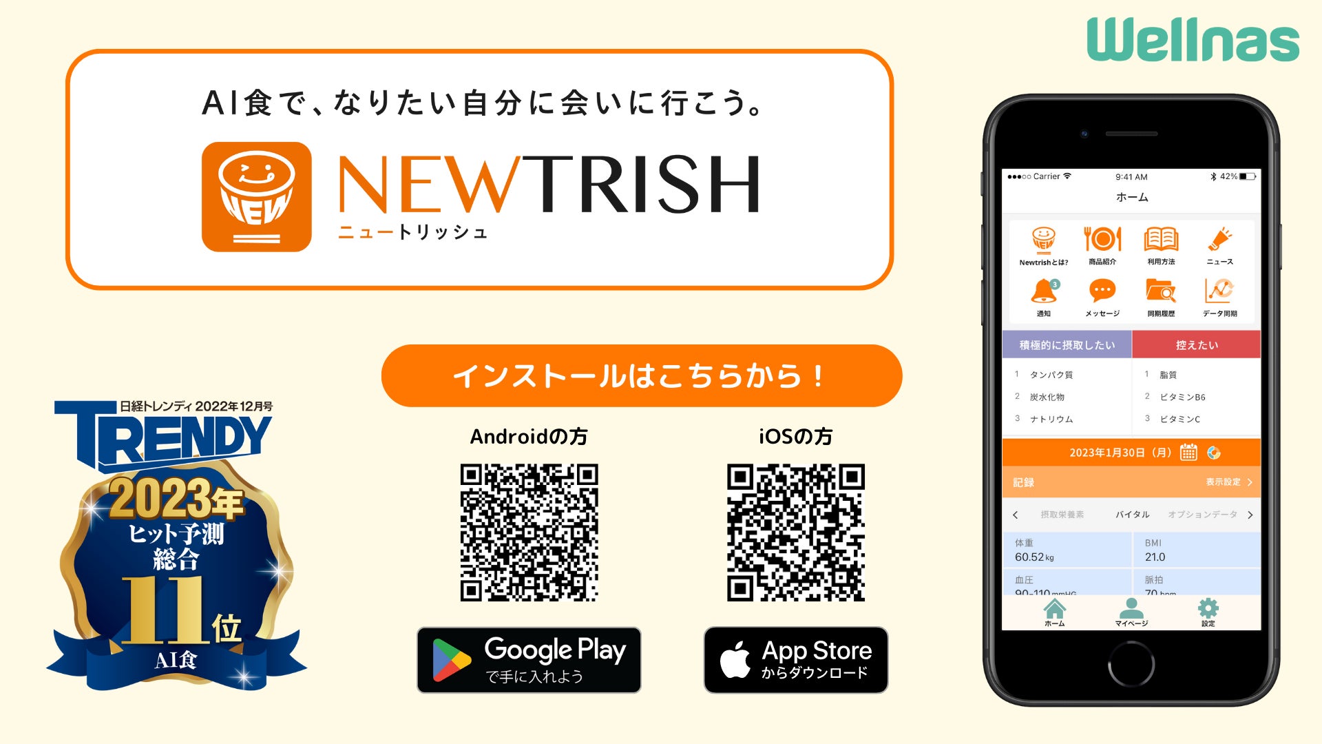 「食」で未来の健康社会実現を目指す株式会社ウェルナス(所在地:東京都杉並区 / 代表取締役社長:小山正浩、以下、ウェルナス)は、2023年1月14日(土)に、個別栄養最適食(AI食)サービス「NEWTRISH(ニュートリッシュ)」※2のスマートフォンアプリケーションを正式にリリースし、App StoreおよびGoogle Play™より、目標達成に必要な栄養素がわかる「Liteプラン(無料)」、必要な栄養素に加えて食材・料理名を知ることができる「Basicプラン(月額1,400円)」、目標達成のために栄養素量が最適化された献立が提案される「Supremacy(β版)プラン(月額44,800円)」※3の3つのプランの提供を開始いたしますので、お知らせいたします。なお、アプリ利用開始2週間は全プラン無料でご利用いただけます。