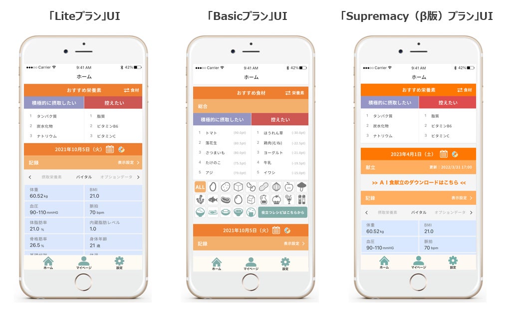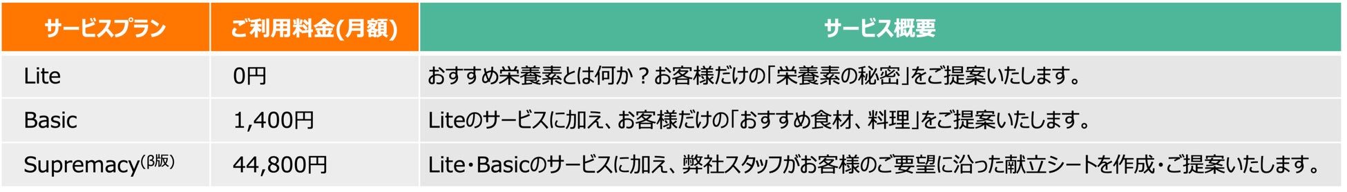 「Liteプラン」は、14日間のデータ学習期間後、目標達成のために積極的に摂取したい栄養素、控えた方が良い栄養素が週に1度提示されるプランです。また、「Basicプラン」は、「Liteプラン」で提供されるサービスに加えて、目標達成のために積極的に摂取したい食材、控えた方が良い食材が、「設定した目標にとってどれだけ役立つのか」を示すオリジナルのポイントであるFF(Fit Food)ポイントともに5位まで提示される他、主食・主菜・副菜・汁物・デザートの5種のカテゴリーで各5つずつオススメの料理名がFFポイントとともに週に1度提示されるプランです。また、「Supremacy(β版)プラン」では、「Basicプラン」のサービスに加えて、個別最適化された栄養素と摂取量を反映した毎食の献立を週に1度1週間分提供するプランです。(「Supremacyプラン」の正式版は、2024年の前半にローンチ予定)