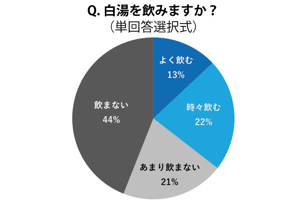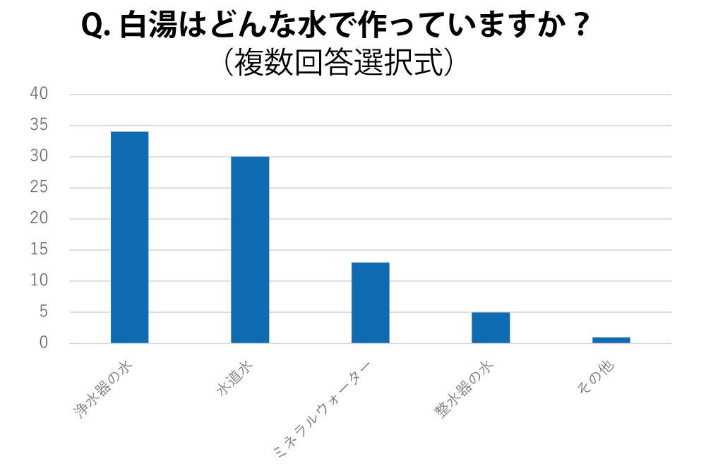 調査では、白湯を飲んでいる人は約4割と日常的に飲むという人はそれほど多くはありませんでした。また、白湯を飲んでいると回答した方に、どんな水で作っているか尋ねたところ、1位が浄水器の水で2位が水道水でした。きちんと煮沸さえすれば、水道水でも問題はありませんが、ポイントは水道水に含まれる塩素やトリハロメタンを揮発させるため、沸騰してもすぐ火を止めず、蓋を開けた状態で10~15分間しっかりと沸かし続けることです。白湯を飲むタイミングは朝・昼・夕の三回に加えて、入浴の前・後にも飲むとよいでしょう。