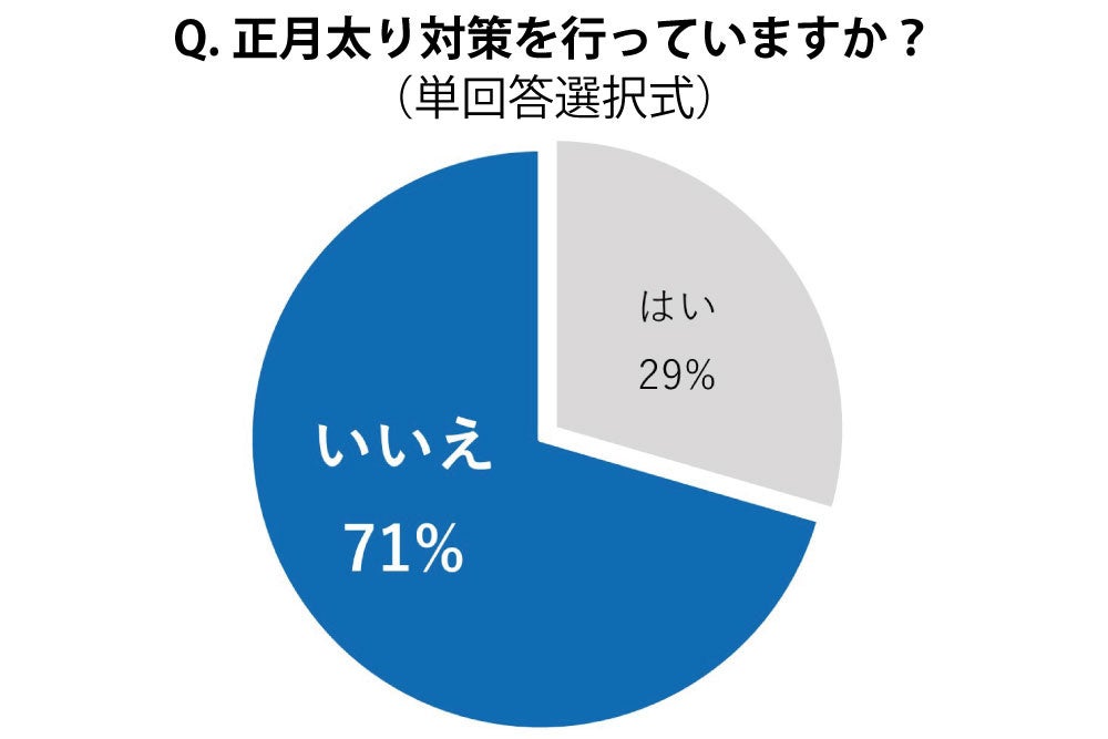 「正月太り」とは、一般的に年末年始の連休で太ってしまうことを指します。忘年会などのイベントの多さや、豪華な料理の食べすぎ、お酒の飲みすぎ、運動不足、生活リズムの乱れなど様々な要因があります。当社が行った調査(*1)でも、約6割の人が正月太りを経験したことがあると答えています。