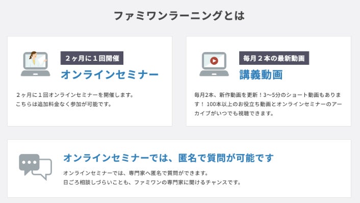なお、これまで「妊活ライブ」で提供していた動画も全て移行しており、ライブ会員さまにつきましてはお手続きなく新サービス「ファミワンラーニング」をご利用いただけるようになっています。