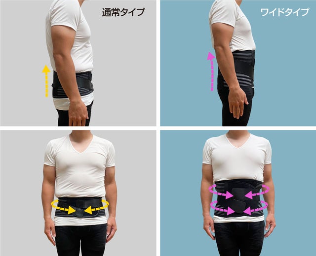 従来の腰ベルトは幅が狭く、腰だけを支えていましたが、ワイドサイズになることで、腰・お腹・背中を同時に引き締め支えるので、より快適な姿勢をキープすることができるので着用すると腰が楽なんです。