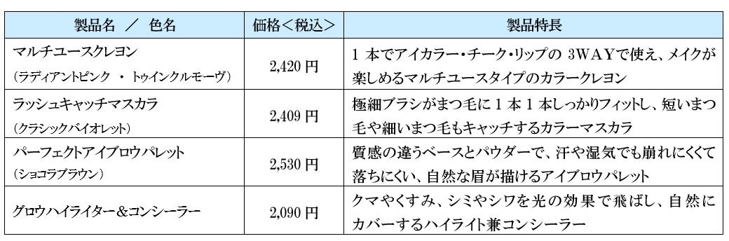 画像左から、マルチユースクレヨン、パーフェクトアイブロウパレット、ラッシュキャッチマスカラ、グロウハイライター&コンシーラー