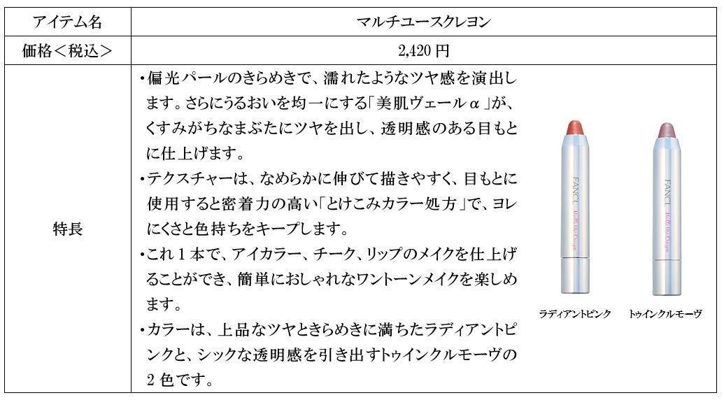 株式会社ファンケルは2月16日(木)から、「2023年 春限定メイク」(全4品目・5種/価格:2,090円~2,530円<税込>)を、通信販売と直営店舗にて数量限定で新たに発売します。コンセプトは「Spring Illumination(スプリング イルミネーション)」とし、透明感のある澄んだ色と繊細な輝きやきらめきに満ちたメイクコレクションです。マスク生活が続く中、眉や目もとのメイクへの関心はさらなる高まりを見せ、特にアイメイクの多様化が求められる傾向があります。また、時短メイクやメイクの落ちにくさのニーズが市場でにぎわいを見せています。本コレクションは、それらを踏まえて一品で3種類の使い方ができる便利なマルチユース機能やメイク持ちを考慮した汗・湿気の耐久性などを持ったアイテムを揃え、トレンドに合わせた色や輝きを演出します。