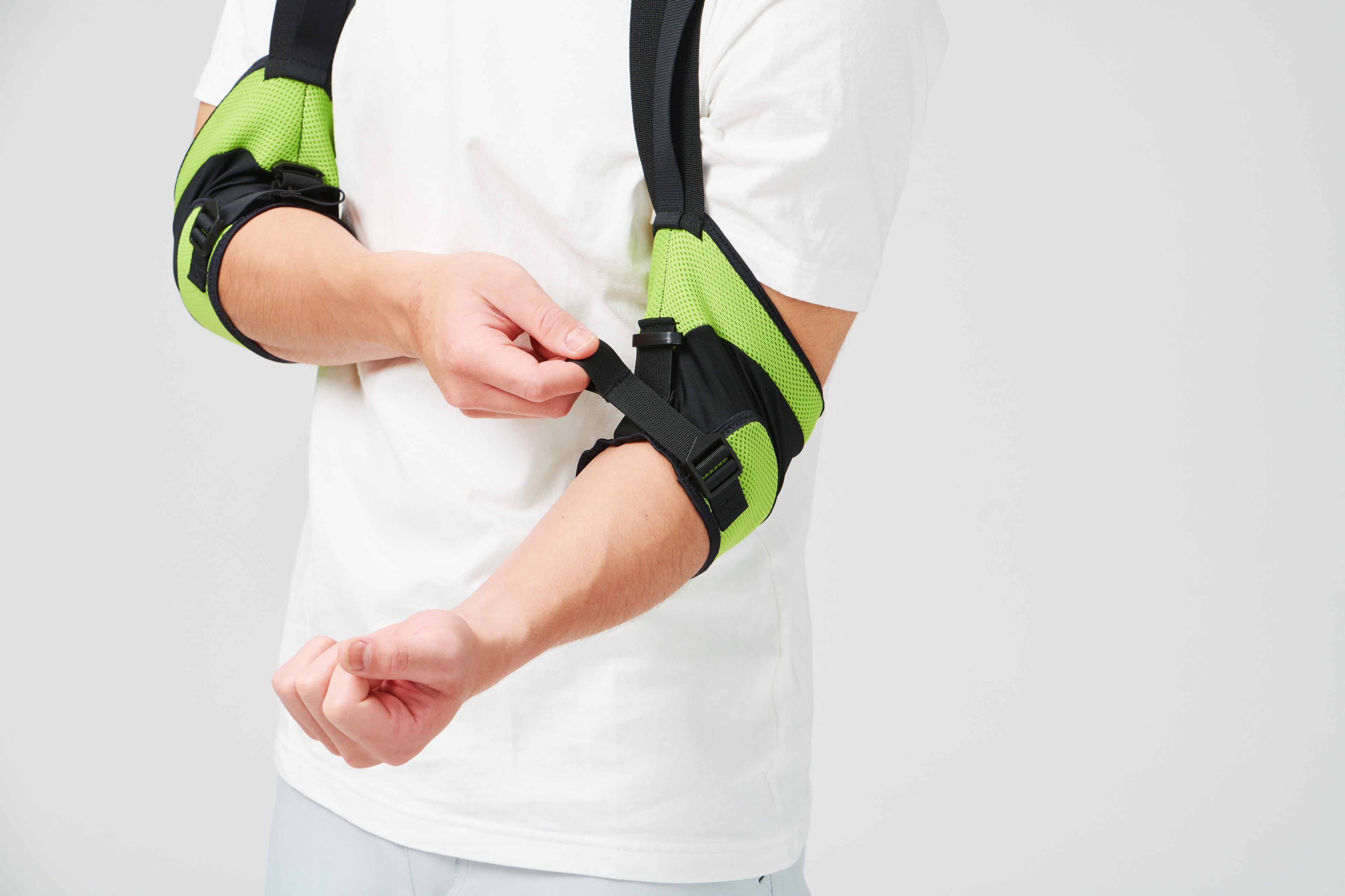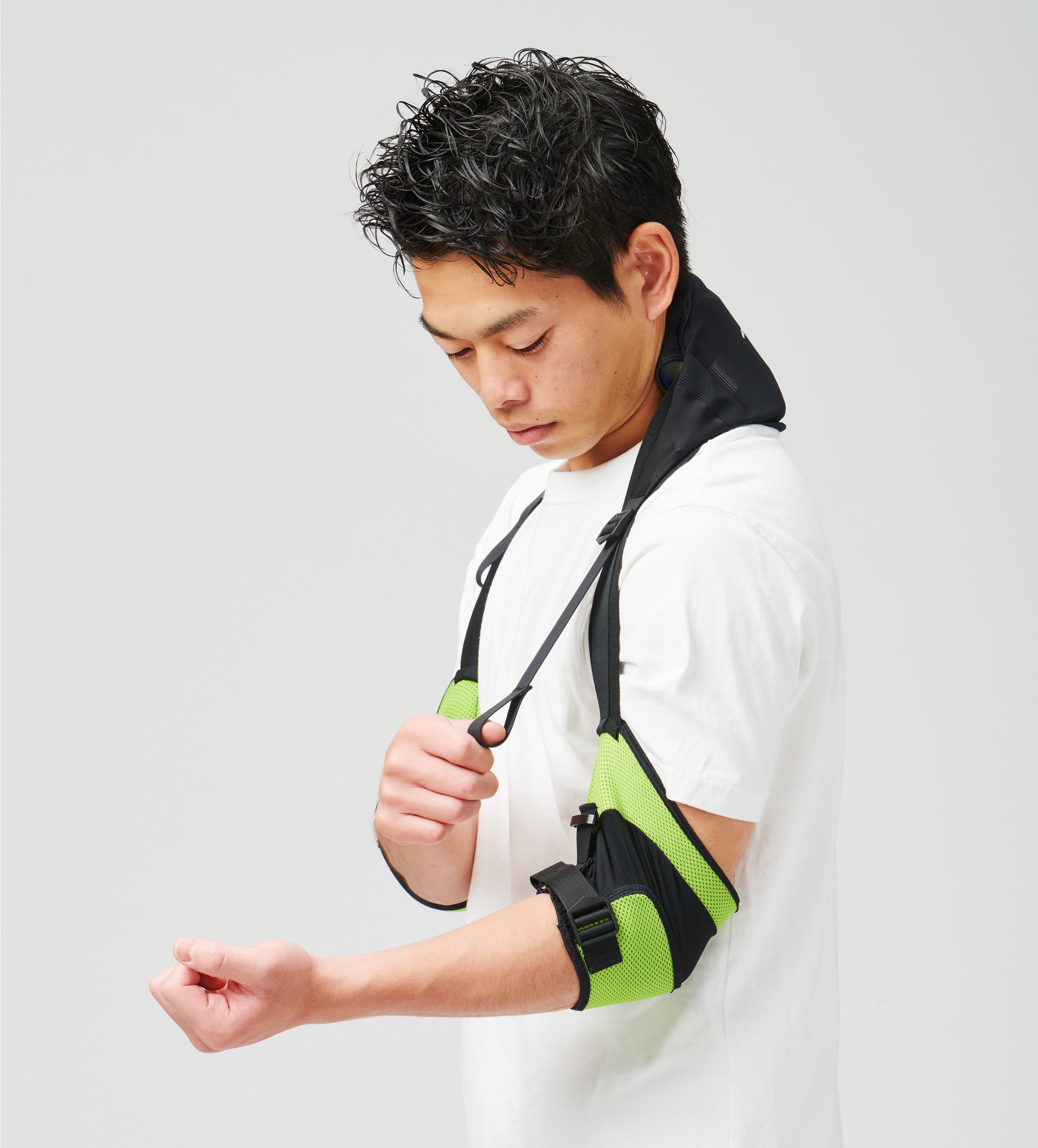 調節ベルトを最大限引っ張ることでサポート力を強めることができます。腕の重さと頭の重さを拮抗させることでバランスをとり長時間の腕上げ姿勢をサポートします。