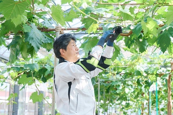桃やぶどうの栽培では⻑時間にわたって両腕を上げる作業が多く、腕はもちろん、首、腰に負担がかかりトラブルに繋がるといったつらいお悩みを聞いてきました。その果樹農家の悩みの種である、摘粒→袋掛け→収穫時の作業負担の軽減を行うことを目的に開発したアシストスーツです。当社で販売していた腕上げ作業に特化したアシストスーツが発売から約4年経過し、機能はそのままに、ご要望を取り入れ、より使いやすく「DARWING Agerelude」としてフルモデルチェンジしました。