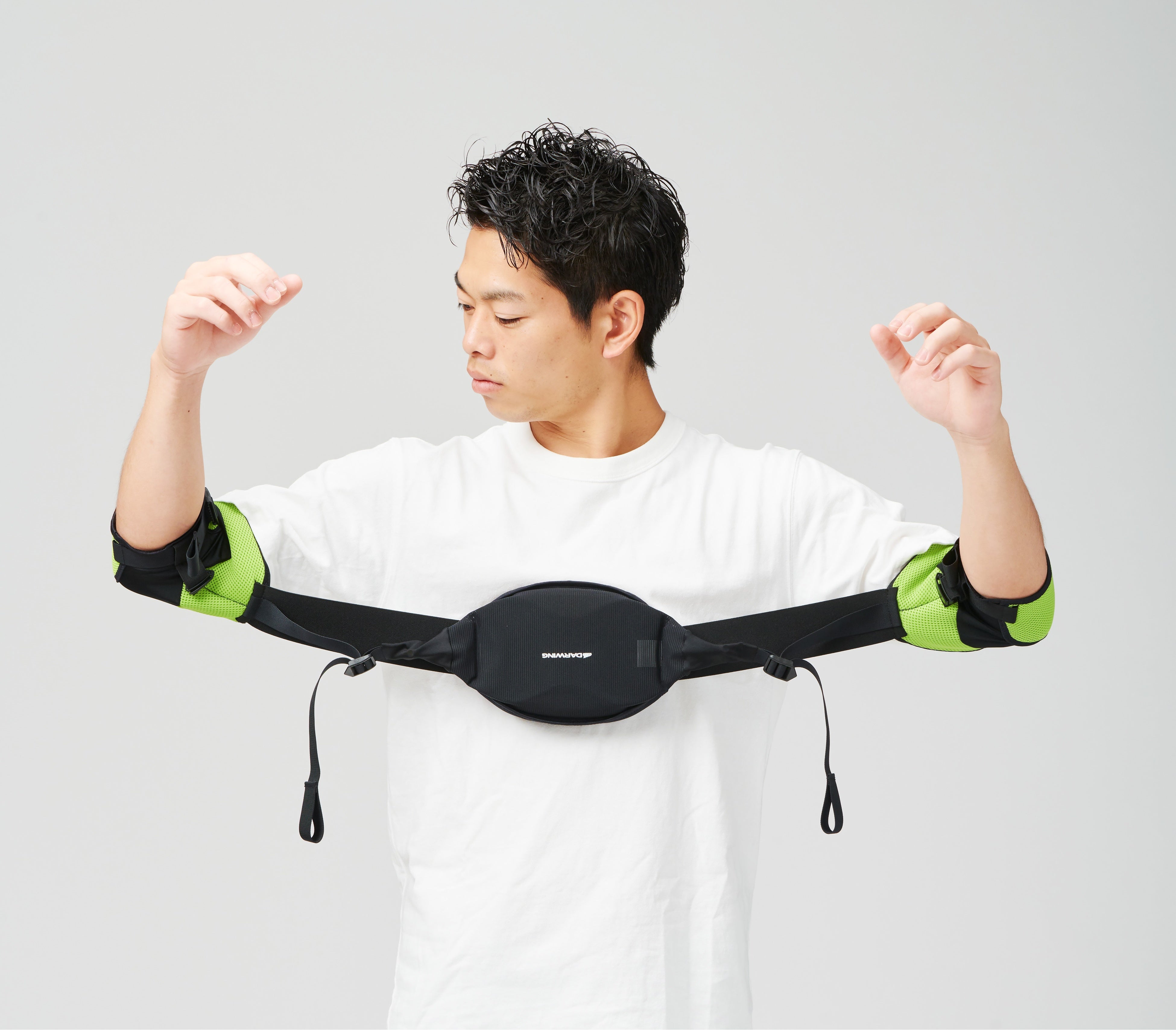 従来の仕様はベルトがバラつき、装着が分かりにくいといったことがありましたが、筒状にすることで腕が通しやすくなり、簡単に装着できるようになりました。