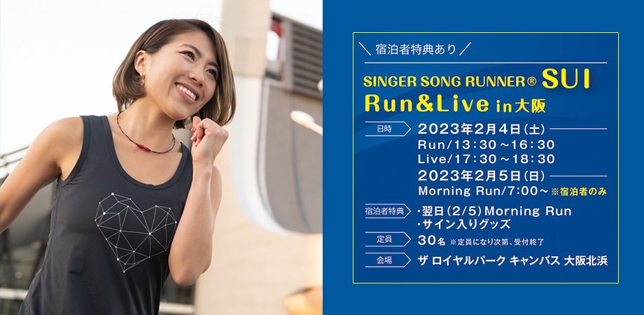 ザ ロイヤルパーク キャンバス 大阪北浜(所在地:大阪市中央区北浜1-9-8 総支配人 本間 貴之)は、2023年2月4日(土)に、走って歌う「シンガーソングランナー」として活躍し、2022年大阪国際女子マラソンでは2時間57分31秒を記録したSUI氏を講師として迎え、ストレッチやボディケアの講習と中之島公園や大阪城まで実走、そしてライブを楽しむ「RUN & LIVE」イベントを開催いたします。
