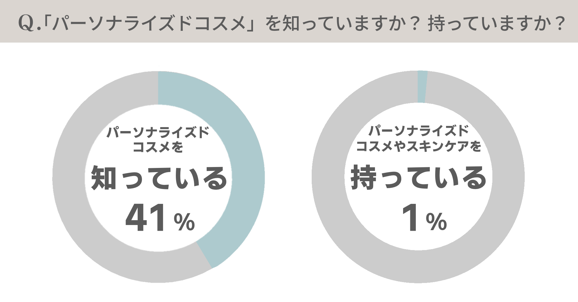 今回のアンケートでは「パーソナライズドコスメを知っている」という方が41%、「パーソナライズドコスメやスキンケアアイテムを持っている」という方が1%という結果となりました。