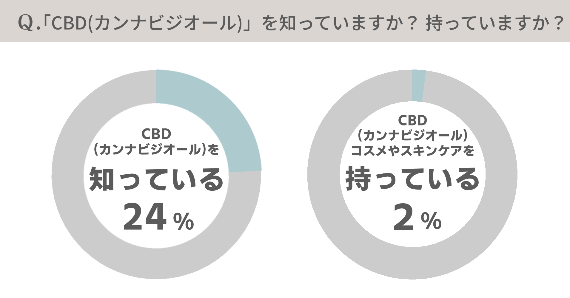 今回のアンケートでは「CBD(カンナビジオール)を知っている」という方が24%、「CBD(カンナビジオール)成分を用いたコスメやスキンケアアイテムを持っている」という方が2%という結果となりました。