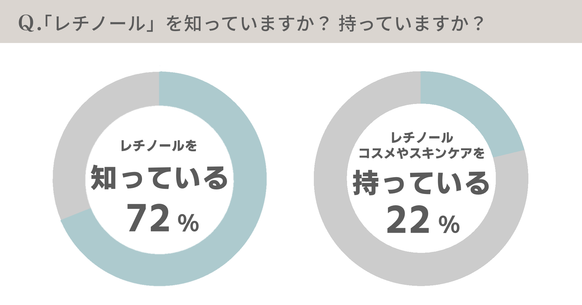 今回のアンケートでは「レチノールを知っている」という方が72%、「レチノール成分を用いたコスメやスキンケアアイテムを持っている」という方が22%という結果となりました。