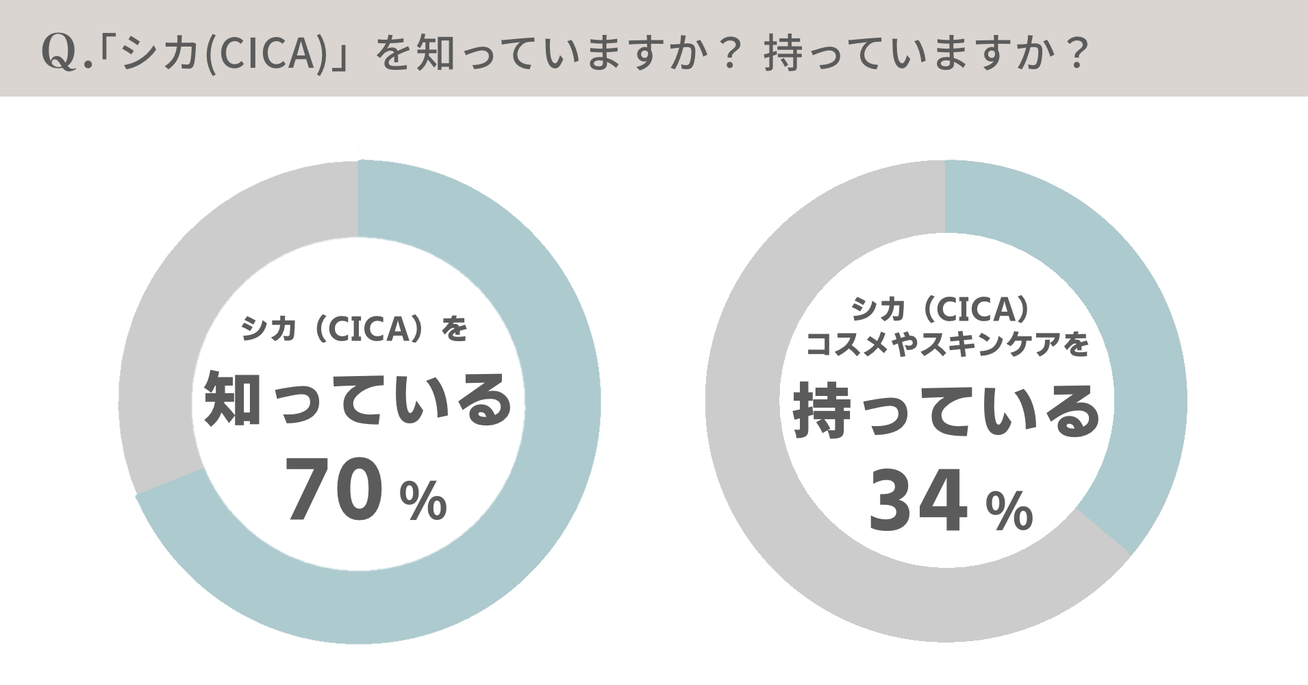 今回のアンケートでは「CICA(シカ)を知っている」という方が70%、「CICA(シカ)」成分を用いたコスメやスキンケアアイテムを持っている」という方が34%という結果となりました。