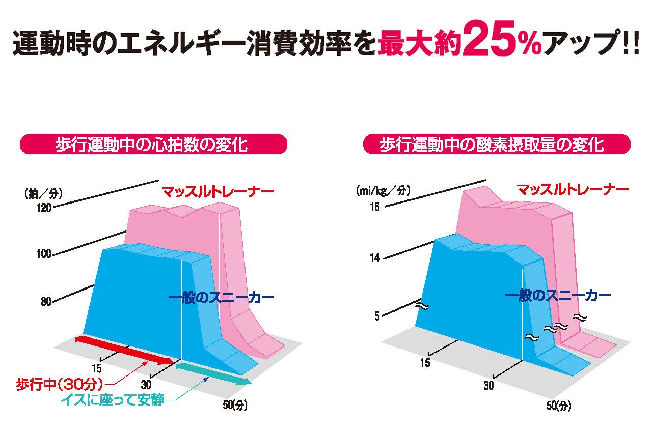 マッスルトレーナーを履いて歩くと、普通のシューズと比べて心拍数と酸素摂取量が共に高くなり、エネルギー代謝が最大で25%アップします。