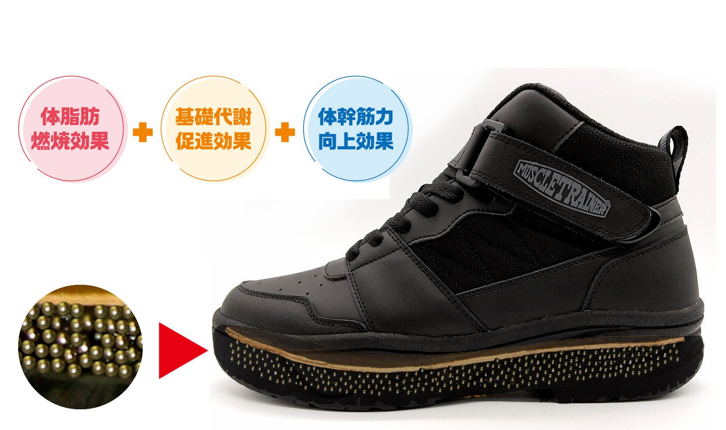 「マッスルトレーナー」は、散歩や買い物、通勤などの日常生活が、履くだけで効率の良い有酸素運動に変わるちょっと重たいウォーキングシューズです。