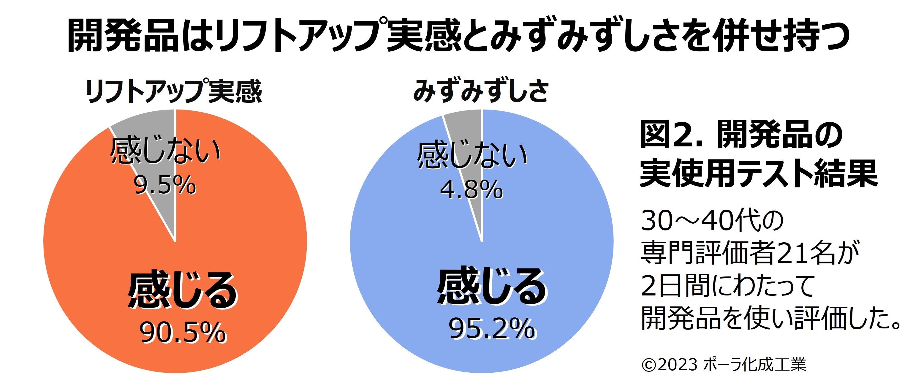 最後に、実使用において目的の使用実感が得られるか確かめました。専門評価者21名が開発品を2日間使い、9割以上がリフトアップ実感とみずみずしさを感じると判定しました(図2)。