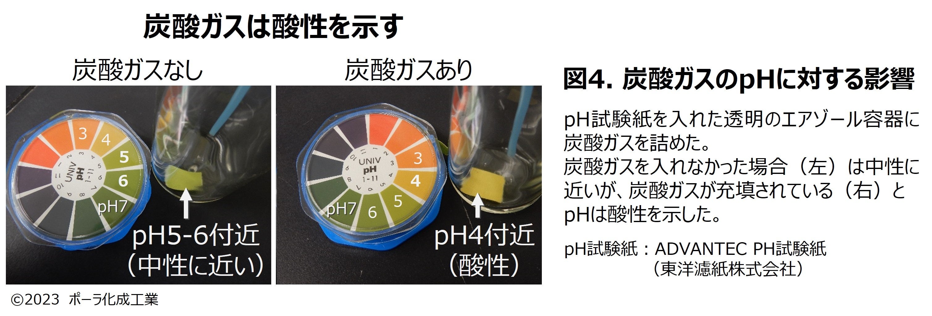 炭酸ガスが酸性を示すことは広く知られています。エアゾール容器に炭酸ガスを充填すると、pHは酸性になりますが、炭酸ガスを入れなかった場合は中性付近となります(図4)。このことから、乳液でも炭酸ガスの気化に伴い、pHの変化が生じていると考えられます。