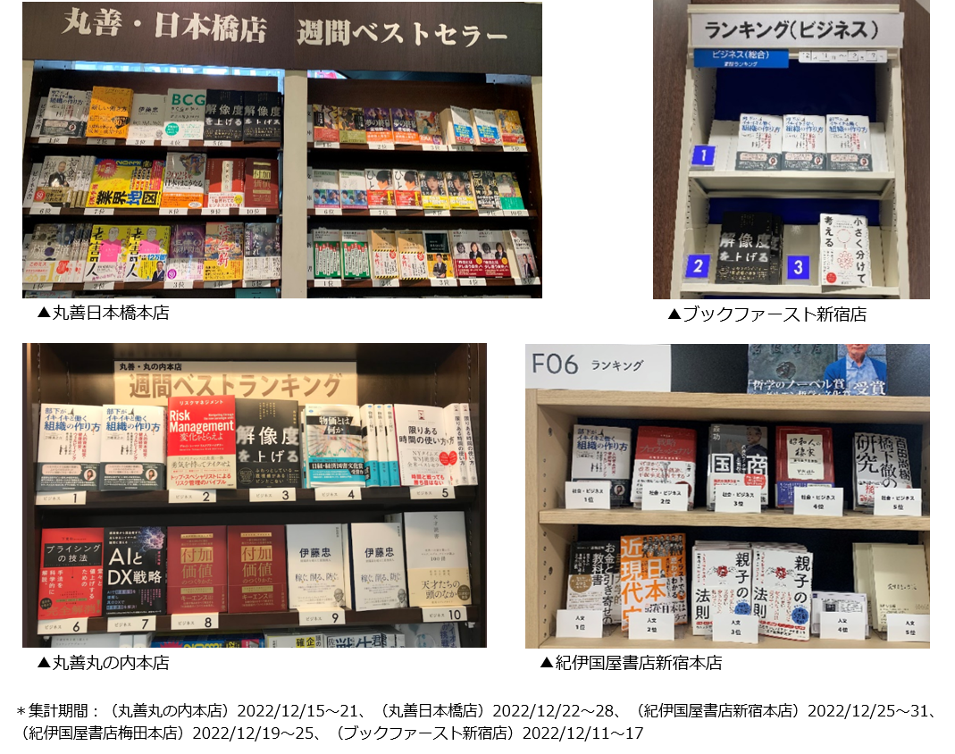 産業医及び産業保健師等による役務提供サービスと従業員の心身の健康管理に関する各種クラウド型サービスを提供する株式会社メンタルヘルステクノロジーズ(所在地:東京都港区、代表取締役社長:刀禰真之介、証券コード:9218、https://mh-tec.co.jp/)は、2022年12月15日(木)に発売した代表取締役社長 刀禰真之介の著書『部下がイキイキと働く組織の作り方 人的資本経営・健康経営・ウェルビーイングを実現するための考え方』(日経BP 日本経済新聞出版)が、丸善の丸の内本店・日本橋店、紀伊国屋書店の新宿本店・梅田本店、ブックファースト新宿店計5店舗のビジネス書ランキングで1位*を獲得したことをお知らせします。