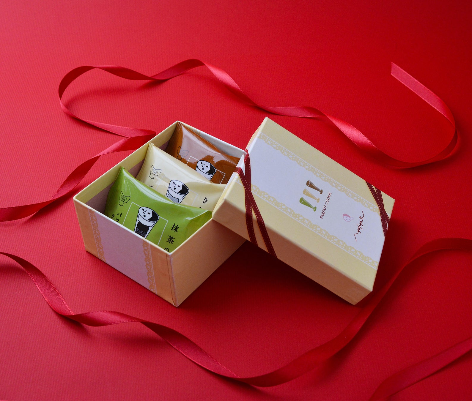 バレンタインにスイーツを贈りたいという方には「バレンタインパフェクッキー」をご用意。クリーム色のボックスにリボンやパフェのイラストをあしらったこだわりの限定ボックスです。蓋をあけるとよーじやカフェの顔パフェをイメージしたクッキー「よーじやカフェのパフェクッキー」3種類(抹茶・きなこ、ミルクティー)が入っており、店舗では限定ボックスにお好きなフレーバーを詰めてお求めいただくこともできます。