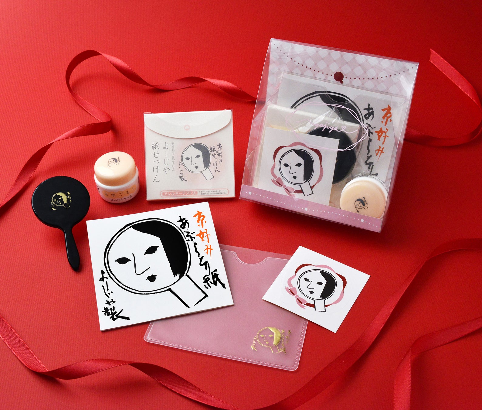 今年のよーじやバレンタインギフトは初の限定パッケージを作りました。「バレンタインギフト2023」は淡いピンク色に手鏡マークがポイントの華やかなパッケージ。中には持ち運びに便利な「まゆごもり はんどくりーむ」や「紙せっけん洗顔用」など日常使いできるアイテム5品が入っております。さらにバレンタイン限定のロゴステッカーも作りました。華やかなリボンを添えた可愛いステッカーです。