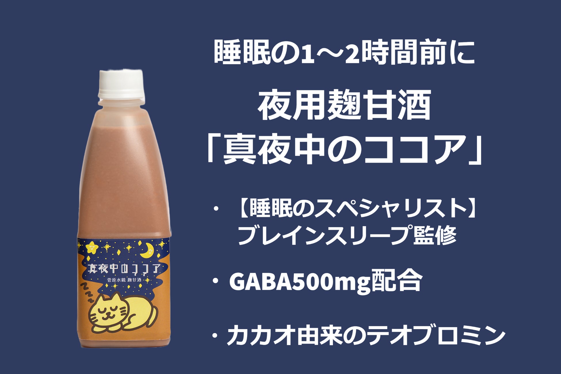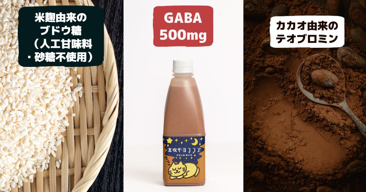 株式会社酒商菅原(本社:福岡県中央区 代表取締役:土師 知子)は、株式会社ブレインスリープ(本社:東京都千代田区 代表取締役:廣田 敦)との「睡眠共創」プロジェクトにより、GABA500mg配合した寝る前に飲む「夜用麹甘酒 真夜中のココア」を開発しました。応援購入サービス「Makuake」にて2023年1月16日より先行販売を開始しました。