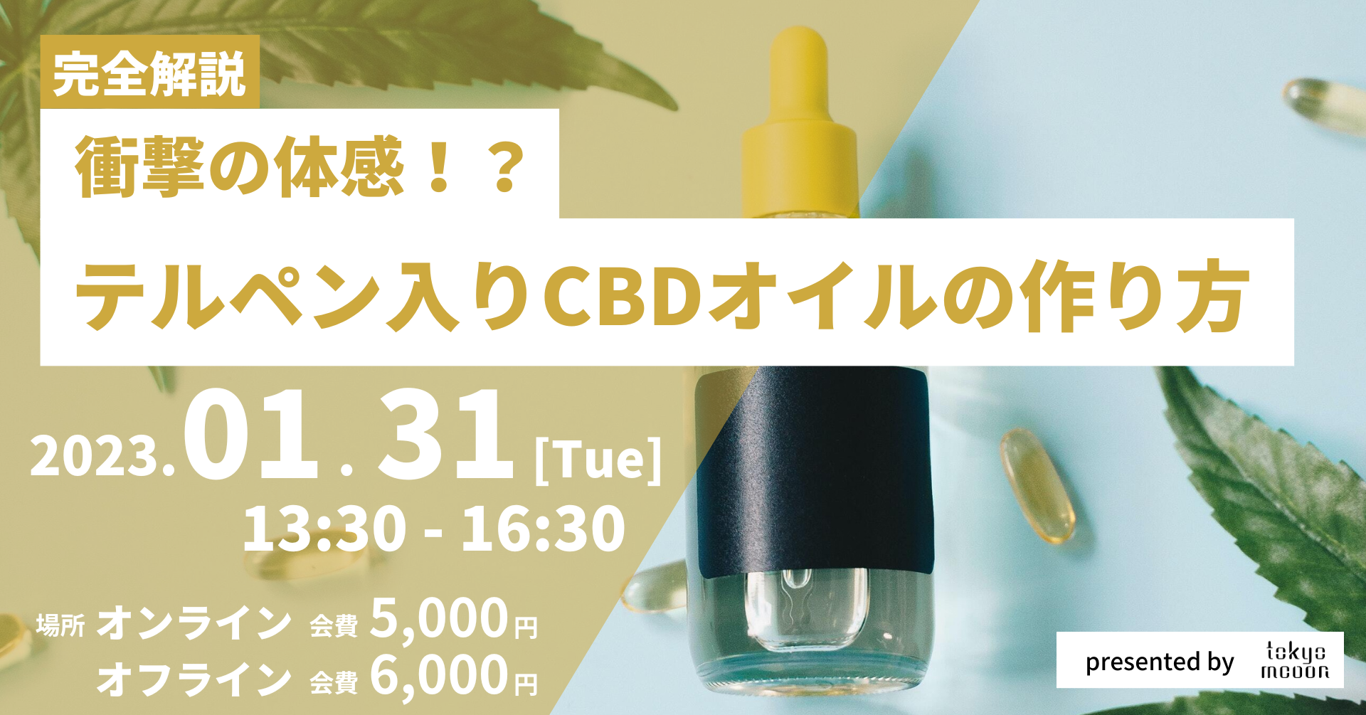 CBD原料の卸売・OEM(製造受託)事業を行うOFF株式会社(本社:東京都目黒区、代表取締役:駒形・井上)は、セミナーイベント『衝撃の体感!?テルペン入りCBDオイルの作り方』を2023年1月31日(火) に開催いたします。オンライン・オフラインどちらでもご参加いただけます。お申し込みはこちら(https://shop.tokyo-mooon.com/products/seminar-terpenes-tincture)
