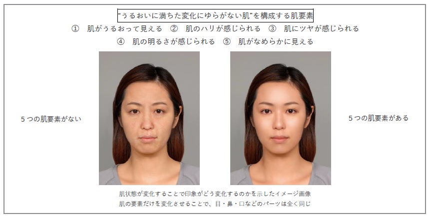 他者へのポジティブな印象を与える肌の構成要素を分解し、それぞれの肌状態を比較することで与える印象や影響についての評価を実施。女性の肌状態を変化させて合成した顔画像を元に、30代女性200名、40代女性200名の計400名にそれぞれの画像の印象と年齢感について10点満点で評価する方法を用いました。結果として、5つの肌要素がある顔においては、特に「自信があるように見える」「いきいきとして見える」「親しみやすそう」などの数値での有意差が見られました。また、全体の印象項目として挙げられる「好印象である」などの数値も高い有意差が見られたことから、5つの肌要素がある肌が相手への印象にポジティブな影響を与えることが分かりました。