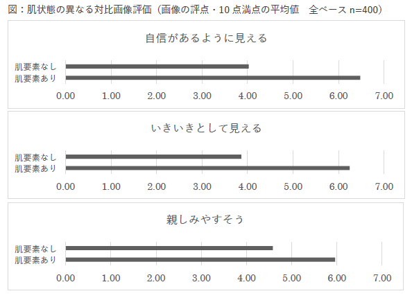 他者へのポジティブな印象を与える肌の構成要素を分解し、それぞれの肌状態を比較することで与える印象や影響についての評価を実施。女性の肌状態を変化させて合成した顔画像を元に、30代女性200名、40代女性200名の計400名にそれぞれの画像の印象と年齢感について10点満点で評価する方法を用いました。結果として、5つの肌要素がある顔においては、特に「自信があるように見える」「いきいきとして見える」「親しみやすそう」などの数値での有意差が見られました。また、全体の印象項目として挙げられる「好印象である」などの数値も高い有意差が見られたことから、5つの肌要素がある肌が相手への印象にポジティブな影響を与えることが分かりました。