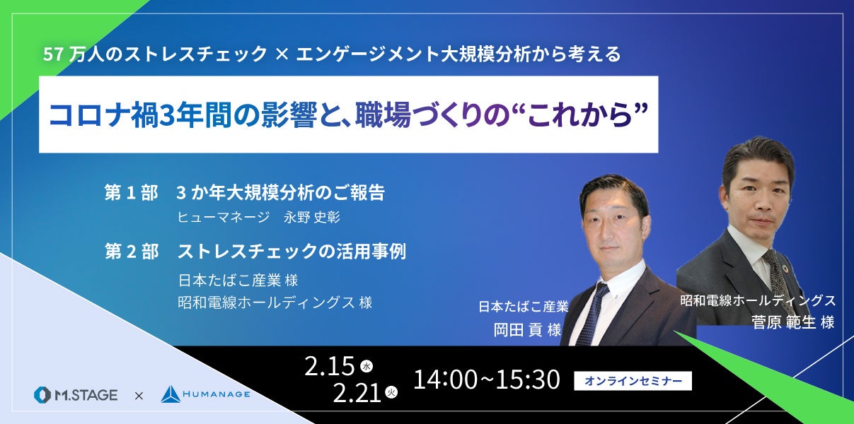 事業場向け産業保健支援、医療人材総合サービスを提供する株式会社エムステージ(本社:東京都品川区、代表取締役:杉田雄二)は、人材の“採用”から“定着”、その先の“活躍”までを支援する人材サービス事業を展開する株式会社ヒューマネージ(本社:東京都千代田区、代表取締役社長:齋藤 亮三)と共同で、人事総務・労務・健康経営ご担当者様向けの無料オンラインセミナーを開催いたします。