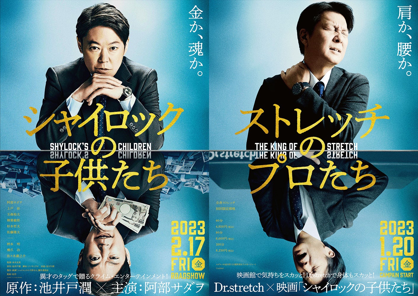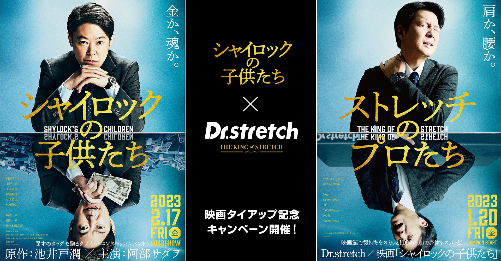 世界200店舗以上で独自技術「コアバランスストレッチ」を提供するストレッチ専門店「Dr.stretch」(株式会社nobitel 本社:東京都新宿区、代表取締役:黒川 将大)は、2/17(金)公開映画『シャイロックの子供たち』(配給:松竹)とタイアップし、本日コラボポスタービジュアルが解禁致しました。また、タイアップを記念して1月20日(金)より期間限定キャンペーンを開催いたします。