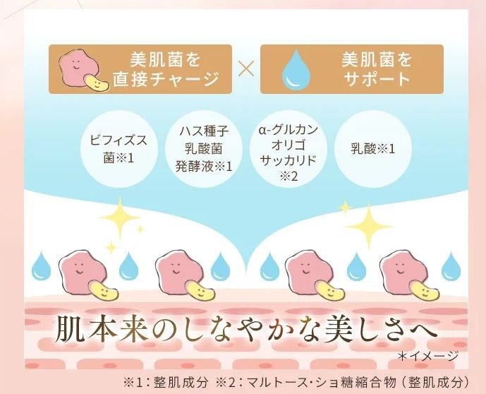 「長く続くマスク生活で肌荒れや肌の質感低下に悩み、さまざまなコスメを試し研究したところ、”美肌菌”という考え方にたどり着きました。肌には数多くの菌が存在しますが、その中で素肌のすこやかさを保つ働きのある菌は加齢と共に減少するため、ビフィズス菌などの美肌菌(※1)と、それをサポートする成分を配合したコスメに着目したのです。(※1 整肌成分)」