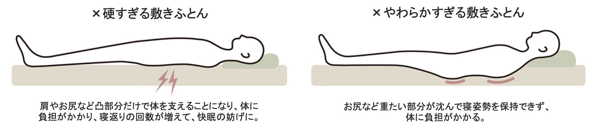 大切なのは体の一部に負担がかかり過ぎず、体のラインを崩さないこと。適度に沈み、仰向け寝はまっすぐ立っている時のような姿勢、横向き寝は背骨・頚椎・後頭部が一直線になるような姿勢が崩れないことが大切です。