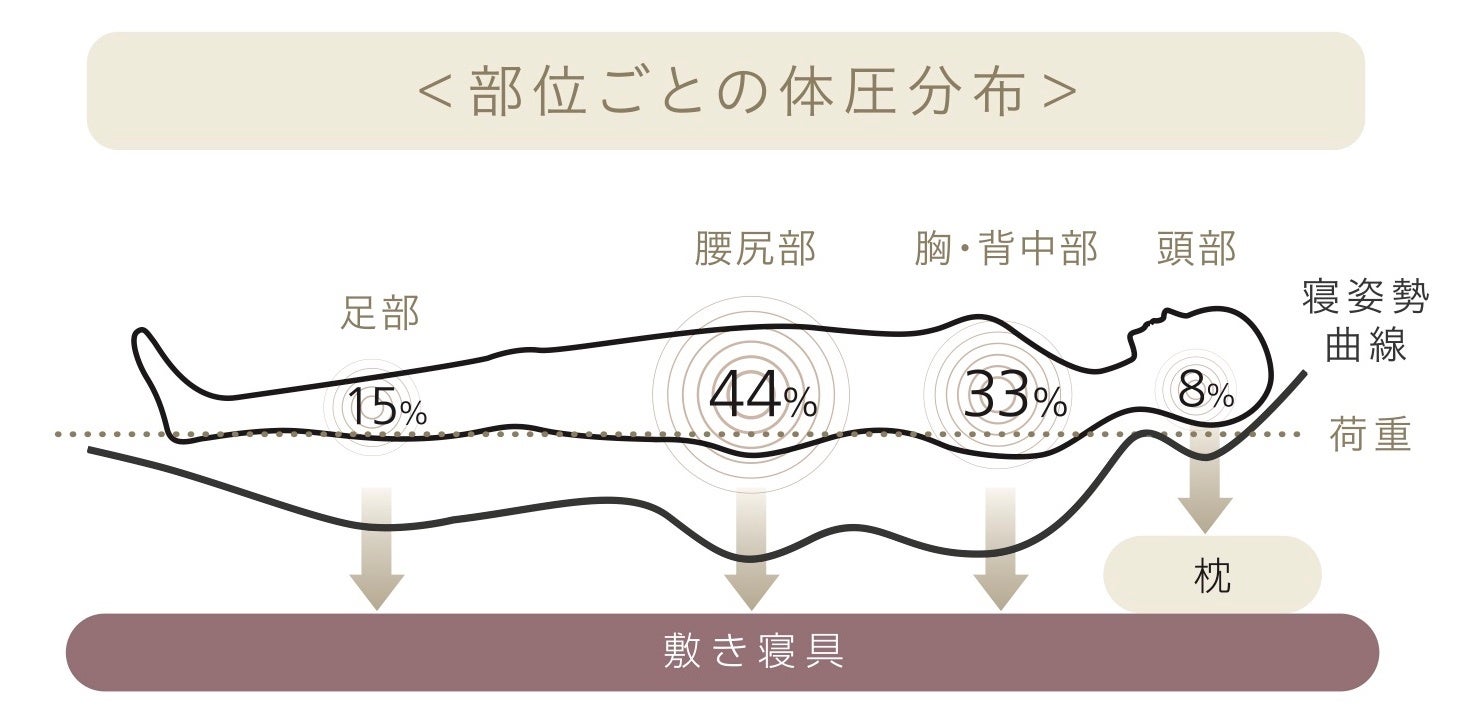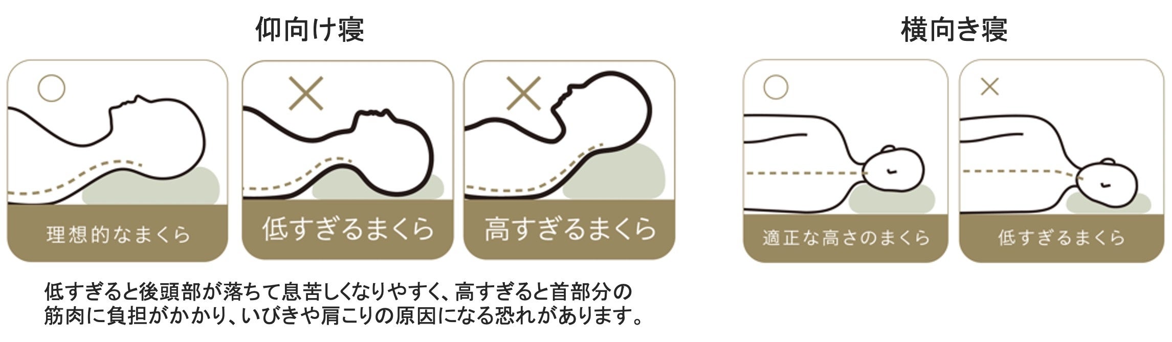 大切なのは体の一部に負担がかかり過ぎず、体のラインを崩さないこと。適度に沈み、仰向け寝はまっすぐ立っている時のような姿勢、横向き寝は背骨・頚椎・後頭部が一直線になるような姿勢が崩れないことが大切です。