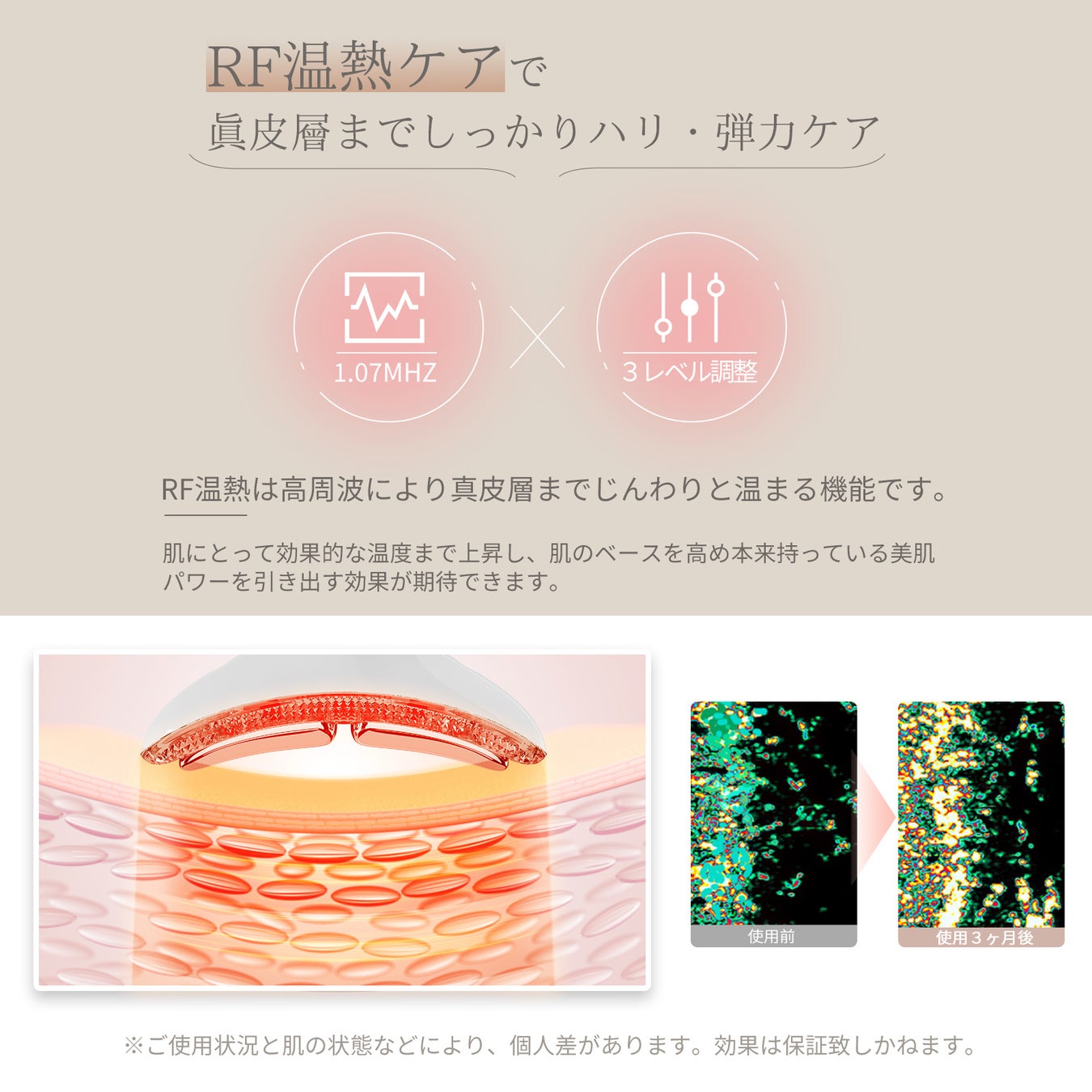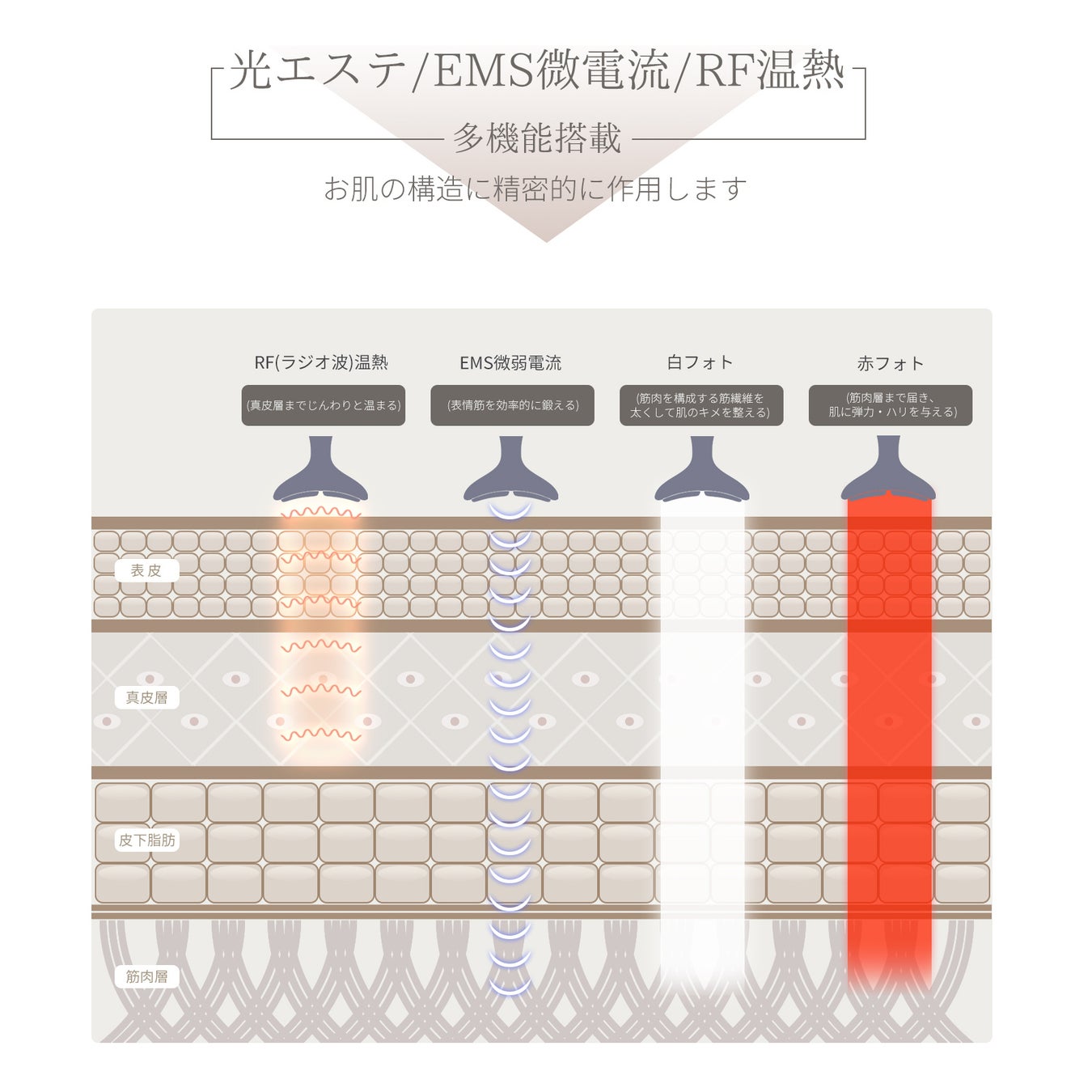 【3種類モード】①【RF】+温熱+赤フォトモード。 ②【EMS】+白フォトモード。③【RF/EMS】+振動モード。微弱電流で肌のベースを高め本来持っている美肌パワーを引き出す効果が期待できます。