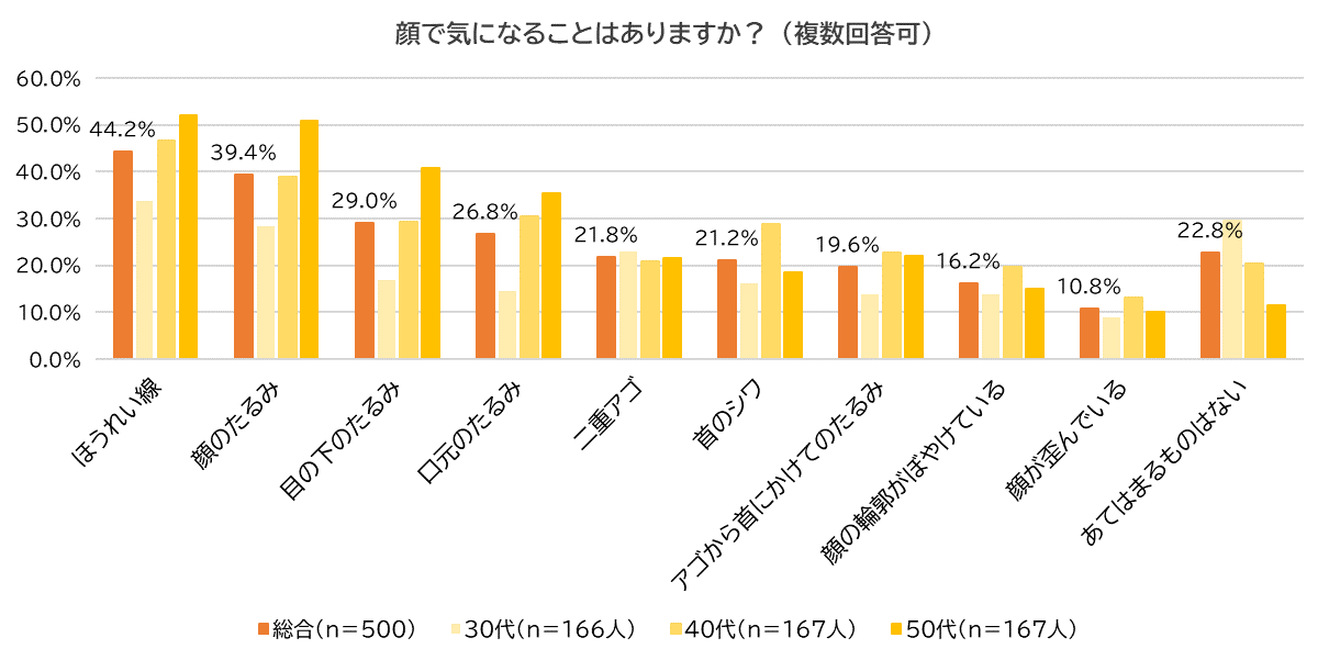 ・顔で気になること 1位「ほうれい線」、2位「顔のたるみ」、3位「目の下のたるみ」