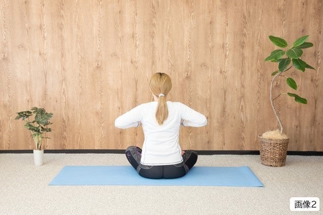 ②背中側で右肘と左肘を近づけるように動かし、胸を開きます。(画像3参照)これを30回行いましょう。