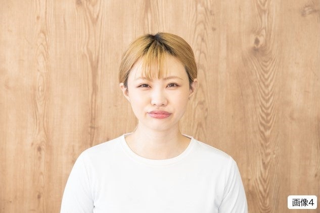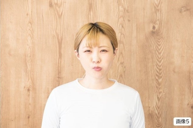 ①最初に硬くなった顔の筋肉を緩めていきましょう。唇を尖らせて、「プルプルプルプル・・・」と唇を震わせながら息を細く吹くリップロールを行います。通常は、ボイストレーニングで行う発声用のトレーニングになるのですが、顔にも振動が伝わるので効果があります。(画像4参照)