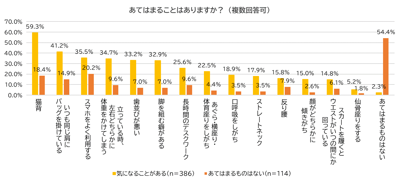 続いて、「気になることがある」「あてはまるものはない」と回答した女性それぞれに「あてはまることがあるか?」聞きました。気になることがある女性の59.3%が「猫背」と回答したのに対し、あてはまるものはない女性は18.4%と40ポイント以上少ない結果となりました。他にも「いつも同じ肩にバッグを掛けている」「立っている時、左右どちらかに体重をかけてしまう」「歯並びが悪い」「脚を組む癖がある」などは気になることがある女性の方が圧倒的に多くいることがわかりました。この結果により、顔のたるみなどは年齢だけでなく、姿勢や体のバランスとも関連性があるのではないかとも考えられます。