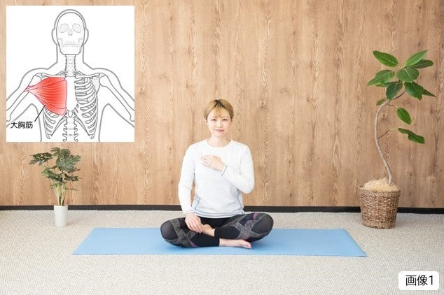 ①鎖骨の下に指をあて、くるくるとマッサージします。(画像1参照)普段から猫背になっている人は筋肉(大胸筋)が硬くなっていて、痛みを感じるかもしれません。弱い力で十分ですので、30秒間マッサージしましょう。