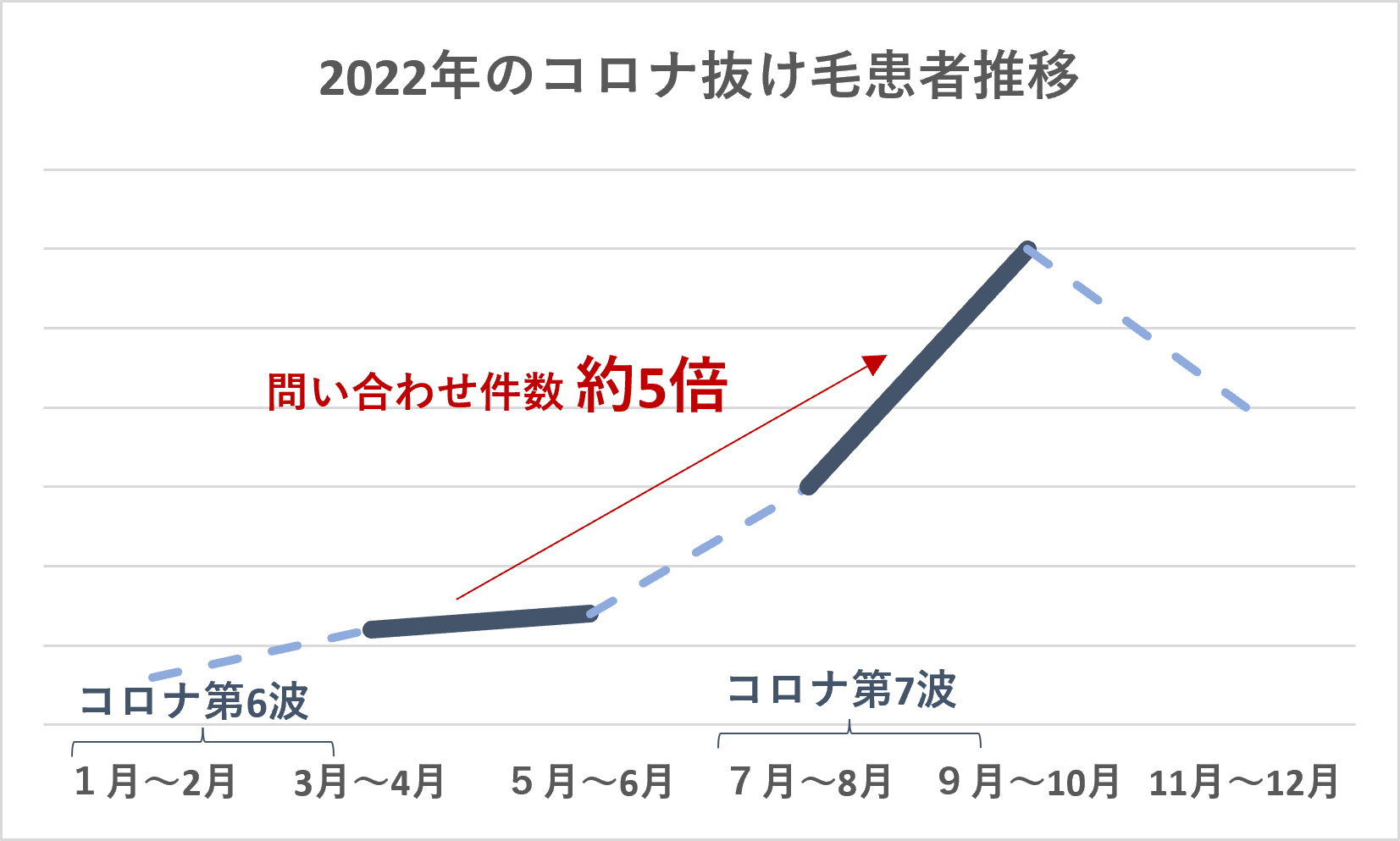 Dクリニックでは新型コロナの後遺症[コロナ抜け毛]の相談窓口を2021年12月に開設。今までの傾向※1からコロナのピークの1ヶ月~2ヶ月後に[コロナ抜け毛]の問い合わせが多くなることが分かっています。また、第7波の感染拡大後は、第6波感染拡大後と比較して、[コロナ抜け毛]の問い合わせ件数※2が5倍に増加しております。新型コロナ第8波の感染拡大によって更なる相談件数が増加すると見込んでおり、引き続き、コロナ抜け毛相談窓口を継続いたします。