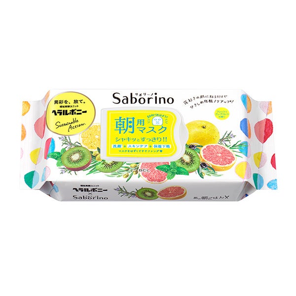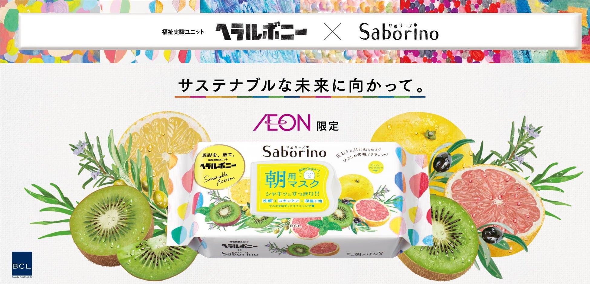 イオンでは、環境に配慮した成分や容器を使用するサボリーノのフェイスマスクを2022年2月から販売しています。2023年は新たに、福祉実験ユニット「ヘラルボニー」が契約する作家が描いたアートをパッケージデザインにした「サボリーノ 目ざまシート フレッシュグレープフルーツの香り」を販売します。