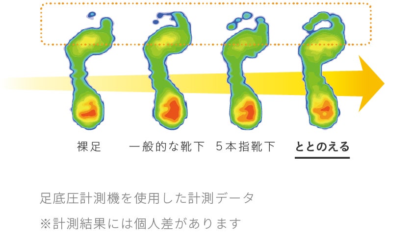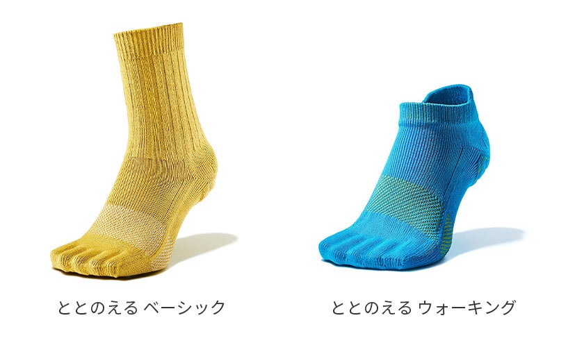 ケアソク〈ととのえる〉は、足指を正しい位置にととのえることで指の接地をサポートし、足裏全体で地面をとらえる足に。従来の靴下よりも健康につながる歩行が可能になります。