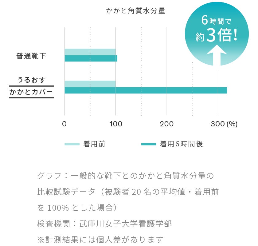 多くの日本人女性が悩む「かかとの乾燥」。かかとは皮脂の分泌腺がないため乾燥しやすく、体重の負荷などにより角質化しやすい性質があります。ケアソク〈うるおす〉の着用により足本来の水分を逃さず皮膚をうるおすことで、ツルツルのかかとに。着用を継続することでかかとのスキンケアをサポートします。