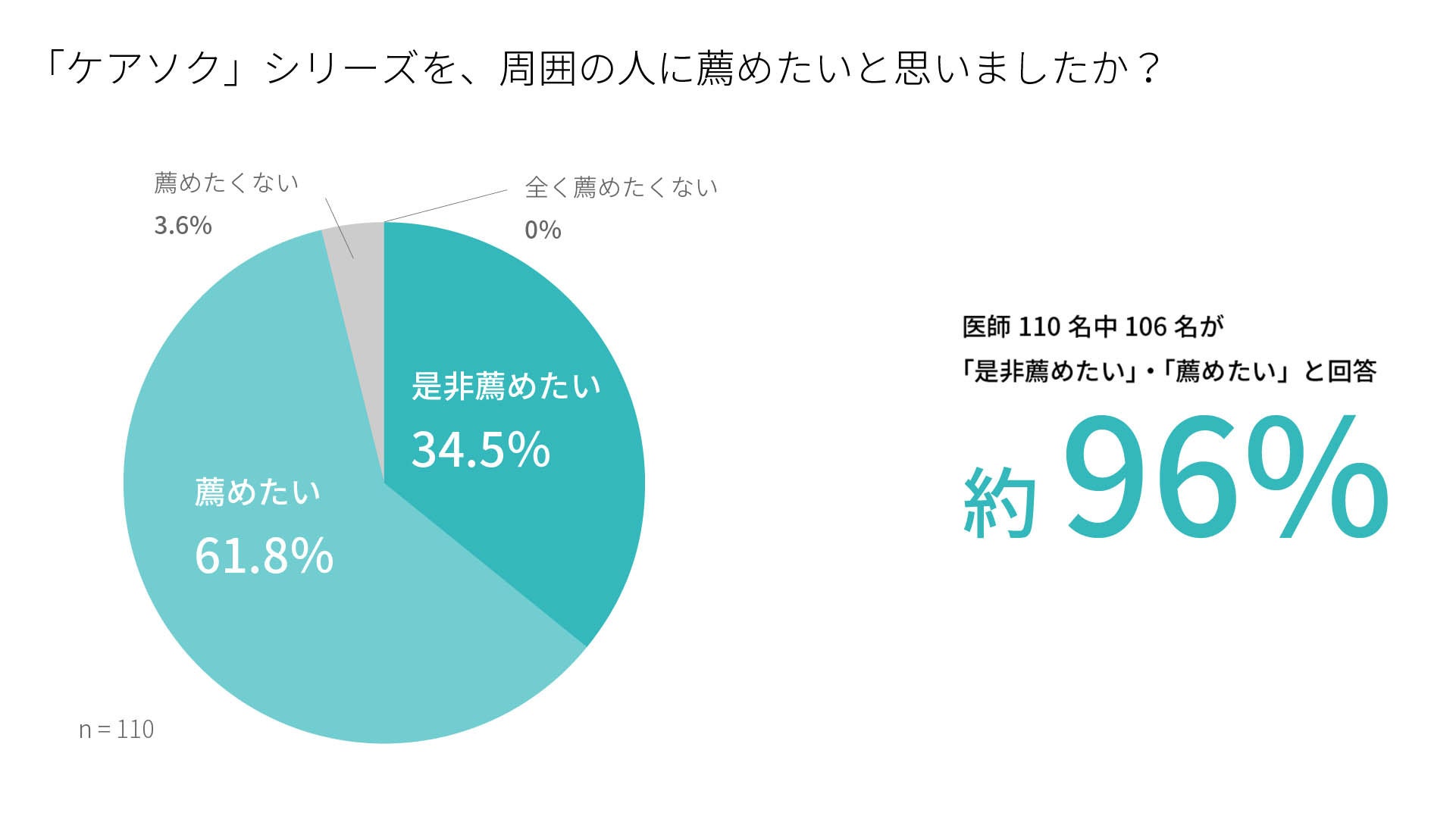 この度、ケアソクシリーズをより安心してお客様に選んでいただくため、「Doctors Me」医師モニター評価サービスを利用して、整形外科医・皮膚科医による第三者評価を実施しました。サンプリングアンケートの結果、110名中106名が「周りの方にお薦めしたい」と回答(※1)。約96%の医師が推奨を示す結果となり、一般的な靴下として初めて「医師推奨マーク」(※2)を取得いたしました。