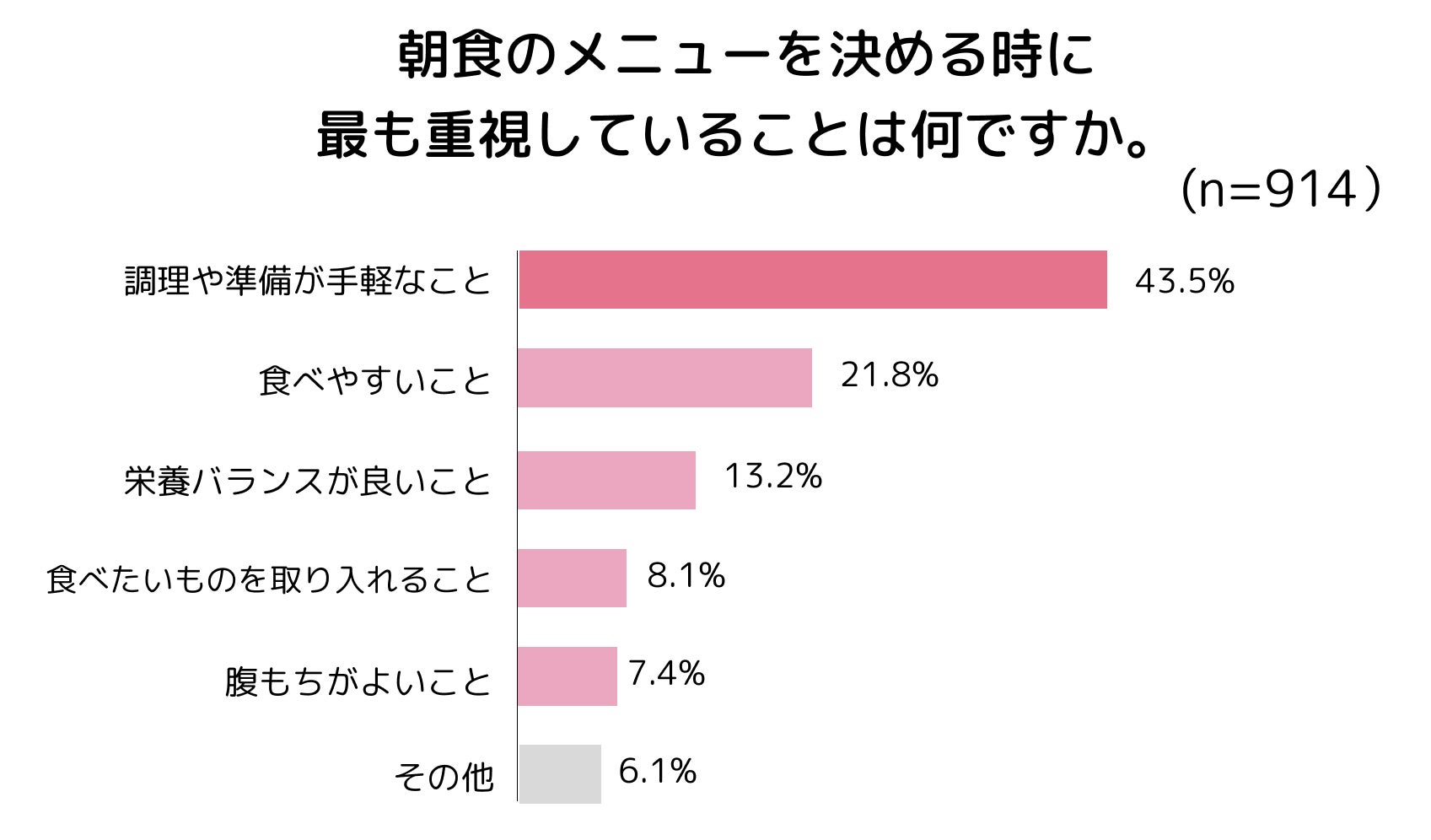 朝ごはんを選ぶポイントとして最も多かったのが、「調理や準備の手軽さ」で、43.5%。栄養バランスがいいことは、13.2%にとどまりました。