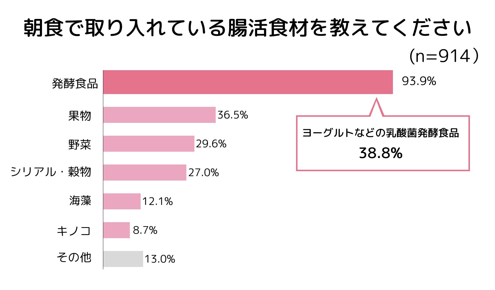 快便の人の53.8%が、朝食に意識的に腸活食材を取り入れていることがわかりました。最も多いのは、発酵食品の93.9%で、その中でも38.8%の人はヨーグルトなどの乳酸菌発酵食品を取り入れていると回答しました。